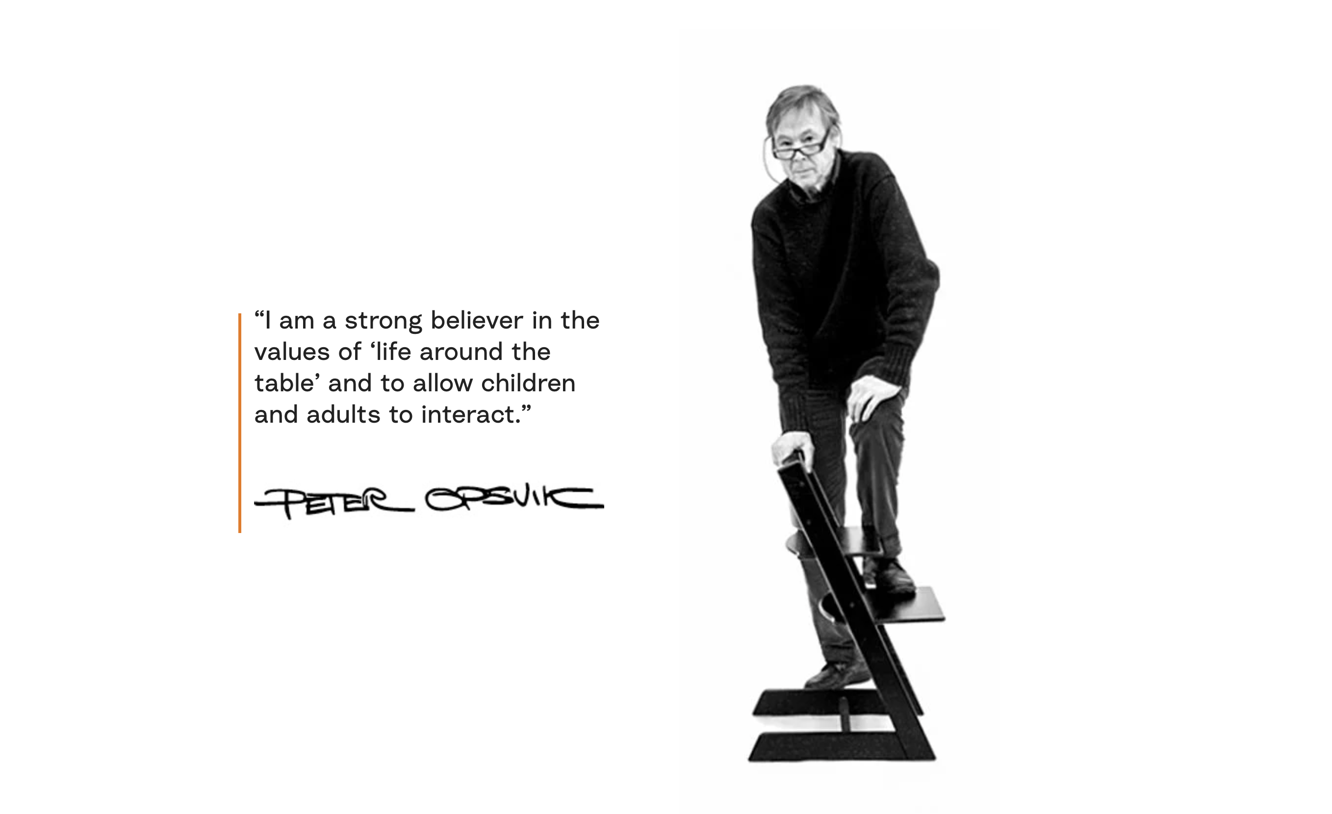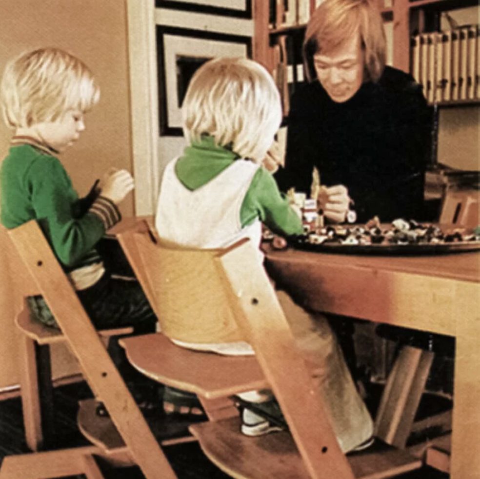 1972 年,在設計 Tripp Trapp® 成長椅時,他立志創造一款不一樣的座椅。這款座椅能夠讓各個年齡階段的成員舒適地坐在同一張餐桌邊。通過降低小寶寶及其父母之間的高度差,讓他們能以平視彼此的方式坐下,全家人就能更方便地互動,豐富餐桌邊的生活。